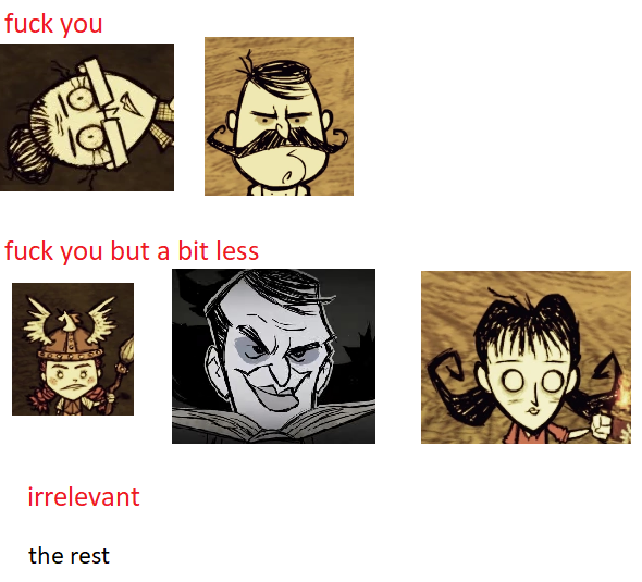 Character tier list don t starve. The dont starve together characters tier list below is created by community voting and is the cumulative average rankings from 27 submitted tier lists. Dont starve together dont starve together general discussion. I desperately need to be more diverse well have at it. Each character plays quite differently from the rest and certain players will have more success with some than others. Dont starve is a game about uncompromising survival you play as one of eleven characters in dont starve together and reign of giants these are. When it comes to the characters wilson is more or less the default.