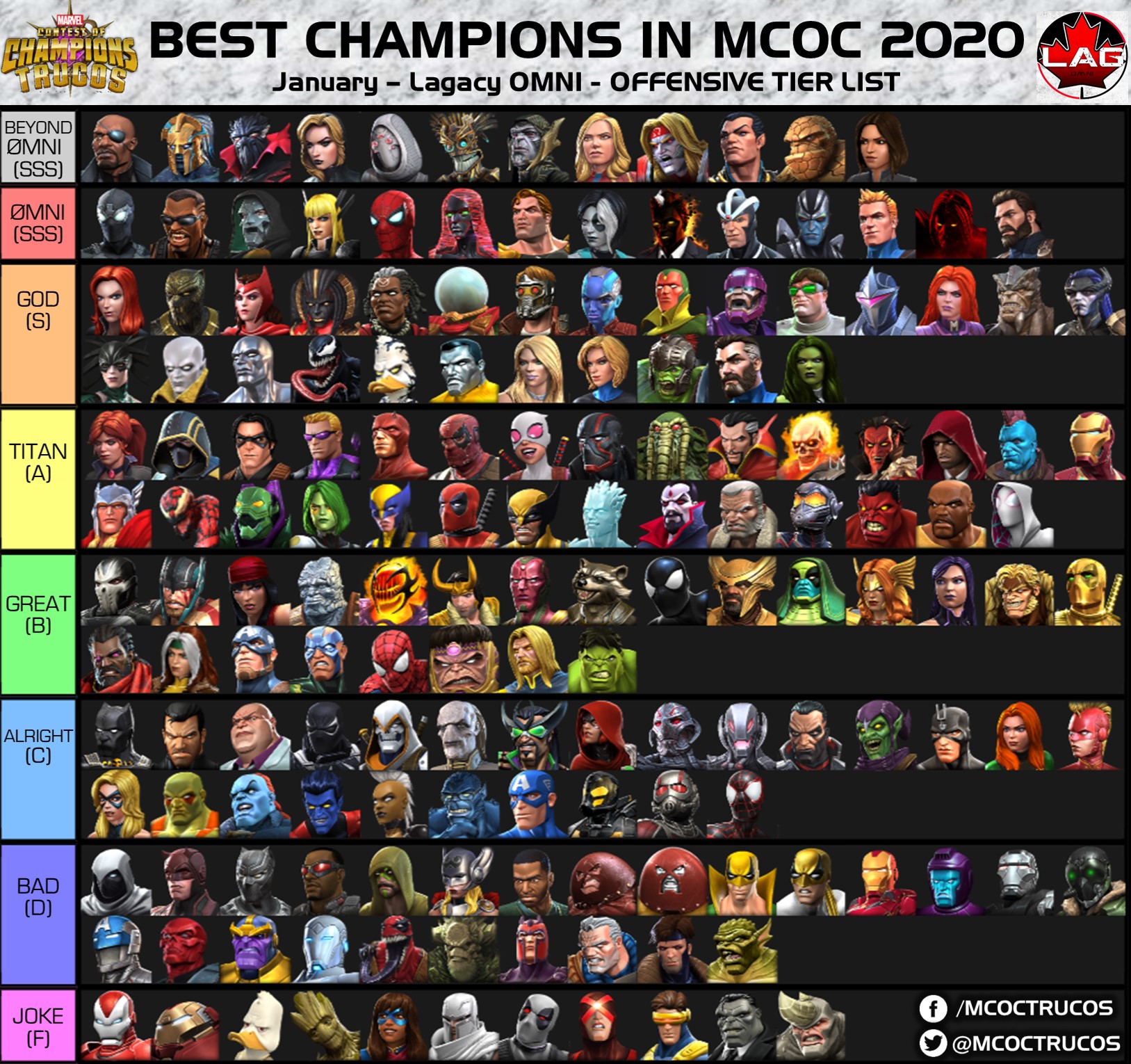 Marvel contest of champions mcoc champs offense tier list divided into different categories the best tier champs to add to your attack team people also know them as god tier champions champions with sign is available as 4 star only and you can max them out. I am open to any kind of feedback you guys have. Here are the official league 1016 patch notes for reference. Best champions in mcoc 2020 tier list. Strange vision wolverine. D must be duped.