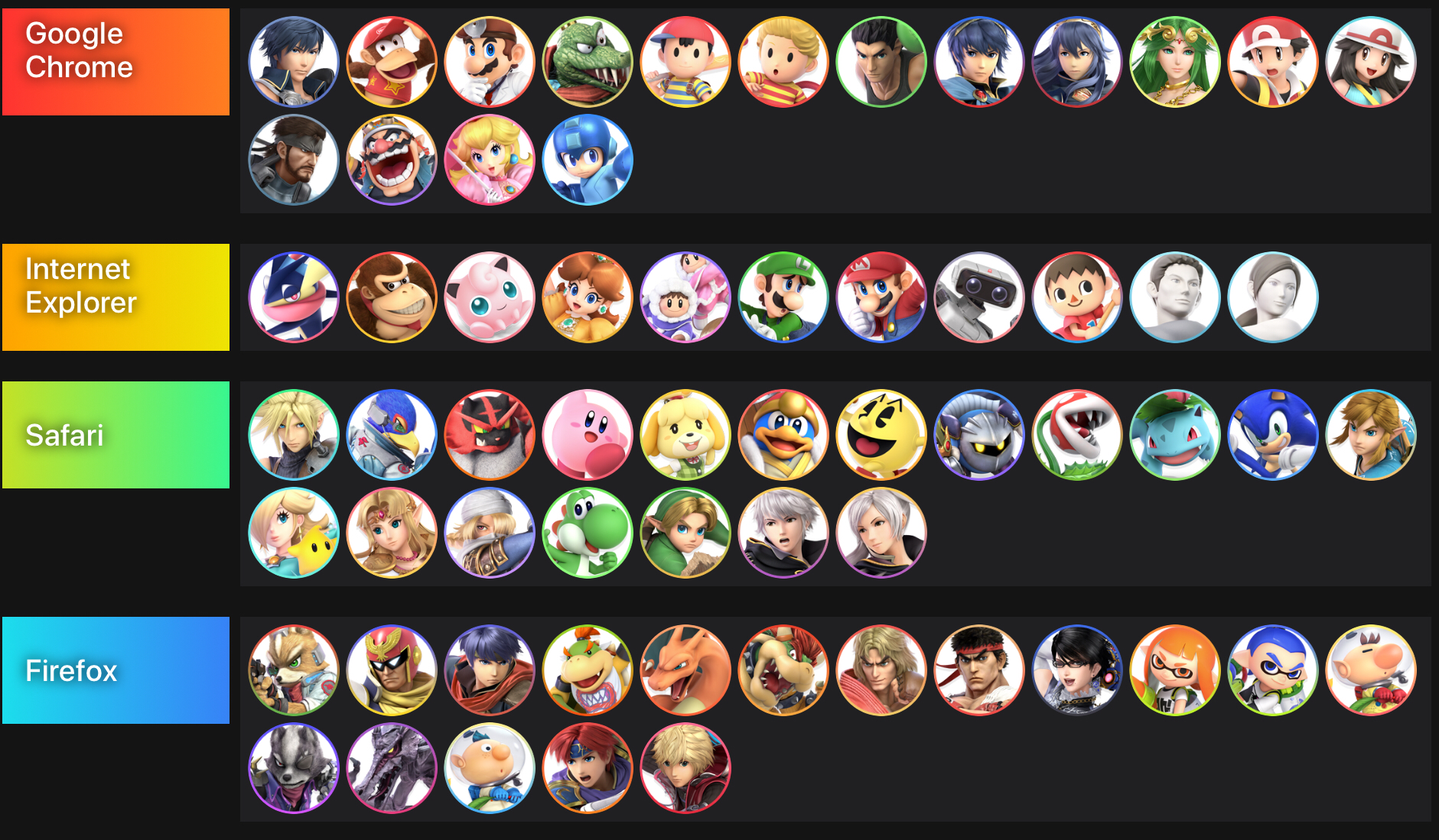 In later tier lists characters are broadly ranked by their tier and further ranked by the order in which characters are listed within the tier list. About our tier listing for super smash bros. Our super smash bros melee tiers section is constructed by way of user generated votes. Marth peach captain falcon b. The tier list is also focused on 1v1 play with no items a restricted stage list and players who understand and use the tactics of their character to their greatest potential and tiers are not relevant in situations where these qualifications dont apply like in matches with more than two players with items on stages not included on the list when characters arent fully utilized or. The following is the tenth smash back room super smash bros.