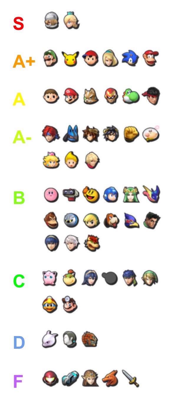 It is current as of december 11th 2017 and reflects version 117 of the game. No character has been voted into s tier for the second time but not in a row. 4 tier list produced by the smash back room. If you dont know then thats fine. S tier is still a valid tier considering smash 4 has had s tier characters before. Sheik zero suit samus rosalina luma a.